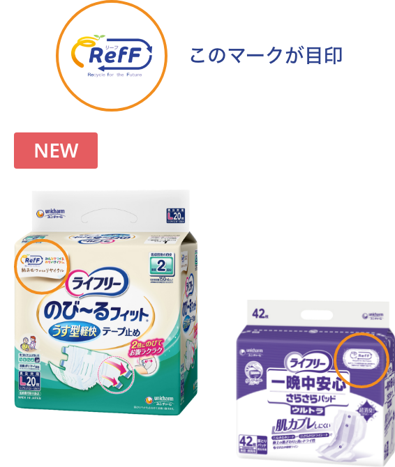 これらの商品は、吸収体の一部に使用済み紙おむつからリサイクルしたRefFパルプや高分子吸水材を配合しています。