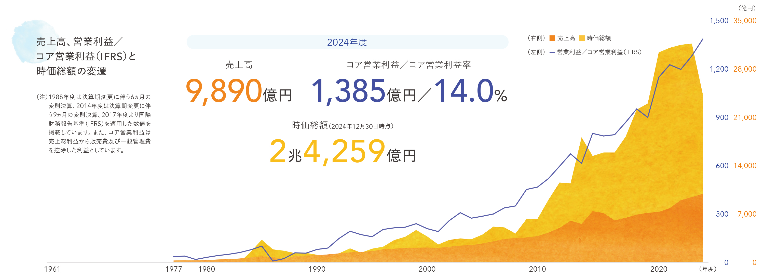 「相対的価値」とは、財務に関わる定量目標として、2030年までに売上高1.5兆円、コア営業利益率17%、世界シェアNo1の実現です。