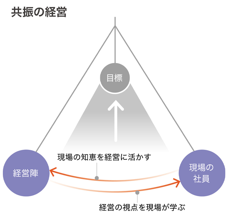 ユニ・チャームでは、独自のマネジメントモデルである「共振の経営」をグループの全社員で実践しています。「共振の経営」とは、経営陣は現場で活躍する社員が有する生の情報に触れ、社員は経営陣の視点、視座、時間軸を学ぶことによって、社員一人ひとりの成長を促し、ユニ・チャーム全体の成長につなげるという経営手法です。社員と経営陣が目的や目標をしっかりと共有することによって、厳しくも心地よい一体感が醸成されます。このような日々の工夫や知恵が社員と経営陣の間を行ったり来たりする振り子のような共振を目指しています。