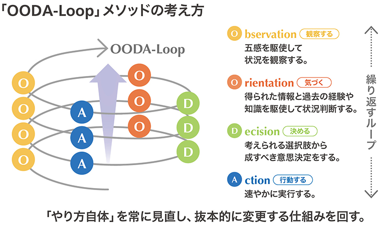 当社では2003年よりPDCAサイクルを主体的に回し、目標完遂に自発的に取り組む「SAPS経営モデル」を運用し、社員の能力向上と組織力向上に活用してきました。しかしながら、環境変化が常態化したNew Normalな近年の環境下においては、変化に機敏に対応するモデルへの修正が必要となりました。このような課題認識に基づき、 2019年に「SAPS経営モデル」から「OODA-Loop」メソッドへと、アップグレードを図りました。「OODA-Loop」とは、「現状観察(Observation)」によって変化を素早く察知し、適切な「状況判断(Orientation)」と「意思決定(Decision)」を行い、「行動(Action)」に移すという一連の流れをループ状に繰り返しながら「やり方自体」を常に見直し、抜本的に変更する仕組みです。この「OODA-Loop」を回すことによって、環境変化に素早く対処し、状況判断と意思決定を行い、成果につながる行動ができる人材へと成長します。