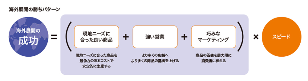 世界のあらゆる地域でユニ・チャームの商品が生活者の皆様から高い評価を得ている背景には、現地の生活実態や消費実態を徹底的にリサーチし、個々の国・地域の文化や生活環境に合わせた商品開発を行っていることが挙げられます。加えて、より多くの小売店に商品を配荷するとともに、デジタル技術を活用した顧客視点に立った売り場づくりを小売店に提案することにより、商品の価値を最大限に伝えています。情報技術の進化とグローバル化が進んだ環境の中で勝ち残るため、よりスピードを意識するとともに、試行錯誤のサイクルを俊敏に回し、環境変化に合わせて「勝ちパターン」を修正することで、海外の各地域に移植させていきます。