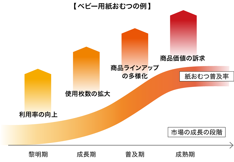 ユニ・チャームは、市場の成長ステージを「黎明期」「成長期」「普及期」「成熟期」に分け、各段階に応じた戦略を明確化しています。市場の成熟度を見極め、適切な商品をタイムリーに投入することで商品の普及率の拡大と収益の極大化を目指しています。また、不織布・吸収体商品の普及率はその国の1人当たりGDPの水準と大きく関係しており、当社では、1人当たりGDPが3,000ドルを超えると生理用品やベビー用紙おむつの普及が一気に進み、さらに1人当たりGDPが高まっていくと生理用品やベビー用紙おむつの普及率が高止まりする一方で、大人用紙おむつやペットケア用品の普及が拡大すると考えています。現在、アジア地域やアフリカ、南米などの新興国で生理用品やベビー用紙おむつの需要が同時多発的に増加しています。さらに今後は、先進国のみならず、アジア地域でも大人用紙おむつやペットケア用品の需要が増加することが見込まれています。また、生理の知識がない、社会的な環境が整っていない国や地域では、政府や現地NGOと協力して女性の社会的進出支援を行っています。こうした取り組みを通じて、海外での当社の知名度とブランドイメージの向上を図っています。