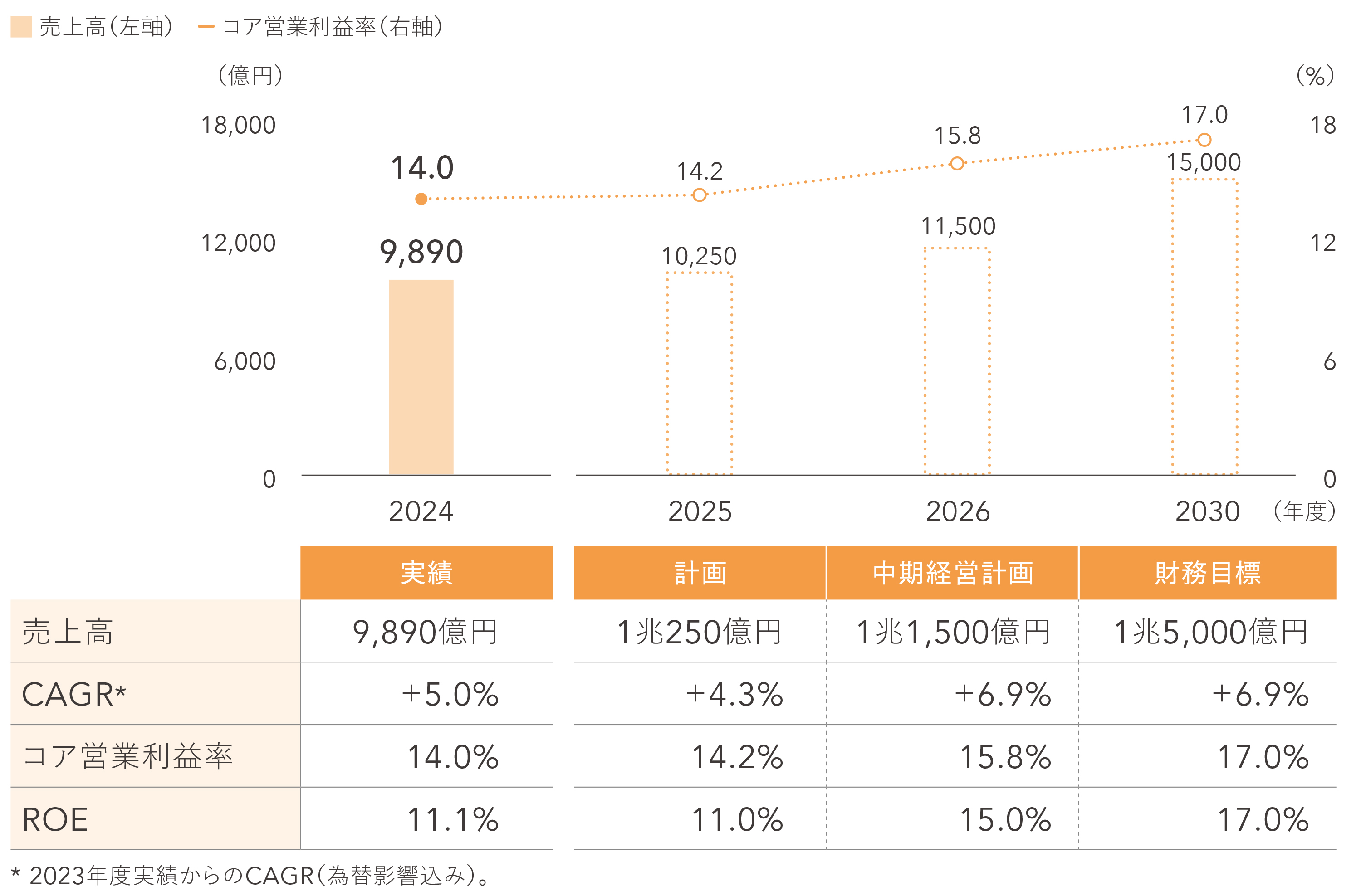 この計画を達成するために、第12次中期経営計画では、CAGRの目標を6.9%、2026年度に売上高1兆1,500億円、コア営業利益率15.8%、ROE15.0%を計画しています。