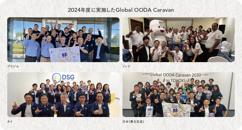 このようなグループ全体で統一したマネジメントモデルを浸透・運用することにこだわるのには理由があります。当社は約80の国・地域で事業を展開する中で、約1万6千名の社員がその事業活動を担っており、それぞれが多種多様な文化・価値観を有しています。この多様性にあふれる社員の足並みを揃える上で「共振の経営」という統一したマネジメントモデルは有効性を発揮します。「共振の経営」をさらに強化すべく、2022年度より、「Global OODA Caravan」を開始しました。これは、私が世界各地の事業拠点を訪問し、現場最前線の社員と膝を突き合わせて本音の対話を行う施策です。これまでの実施回数は18回で、延べ700名以上の社員と直接対話を行いました。