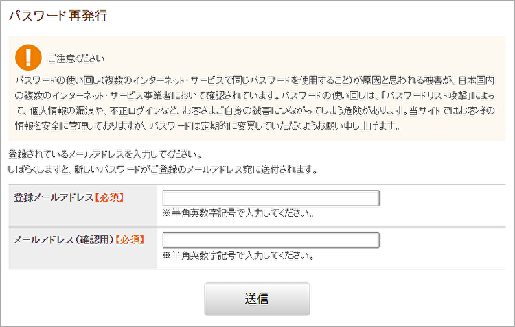 登録メールアドレスを入力し、[送信]ボタンをクリックします。