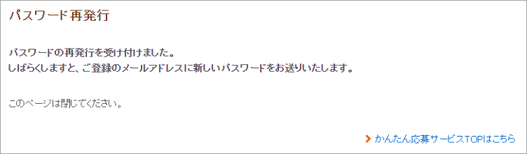 この画面が表示されたら、パスワード再発行手続き終了です。登録のメールアドレス宛に送付している「パスワード再発行」メールをご確認ください。