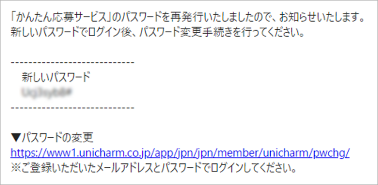 登録メールアドレス宛に、新しいパスワードが記載された「パスワード再発行」メールが送られています。