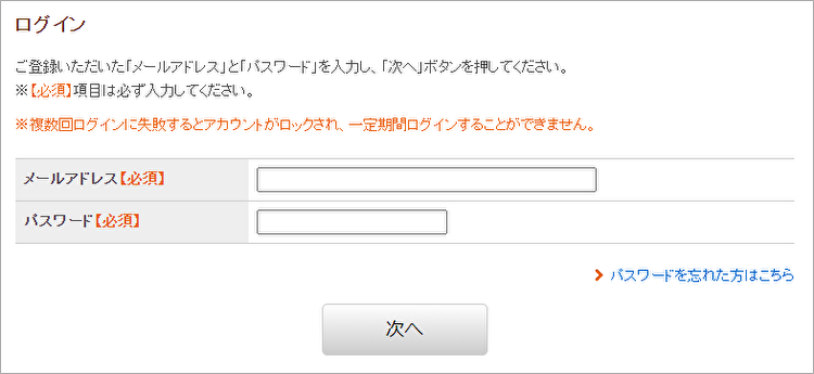 ご登録のメールアドレス・パスワードを入力し、[次へ]ボタンをクリックします。