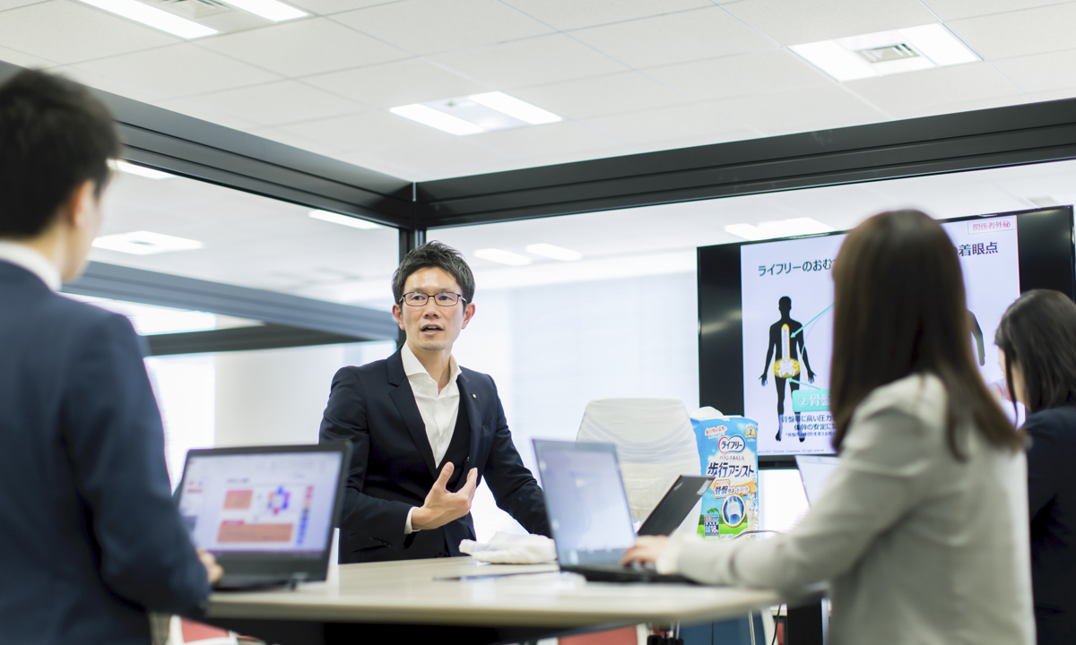 入社当初、営業として右も左も分からない私にできることは、取引先である病院・施設をとにかくたくさん訪問し、現在抱える課題や排泄ケアの取組み状況を資料にまとめて毎日訪問・報告することでした。それを継続することで徐々に話を聞いてもらえるようになり、そのうち新規取引案件を紹介してもらえるようになるまで関係を構築することができました。入社3年目には、営業としての戦略立案を担うプロケア営業の営業企画部に異動。人柄や対話力といった営業担当の個人的なスキルではなく、誰でも同じようなパフォーマンスを発揮できるような分析モデルと提案テンプレートの開発に取り組みました。戦略立案部門としての責任を担う中で、現状を分析して課題設定から企画立案につなげ、それをロジカルに分かりやすく伝える能力が身についたと思います。