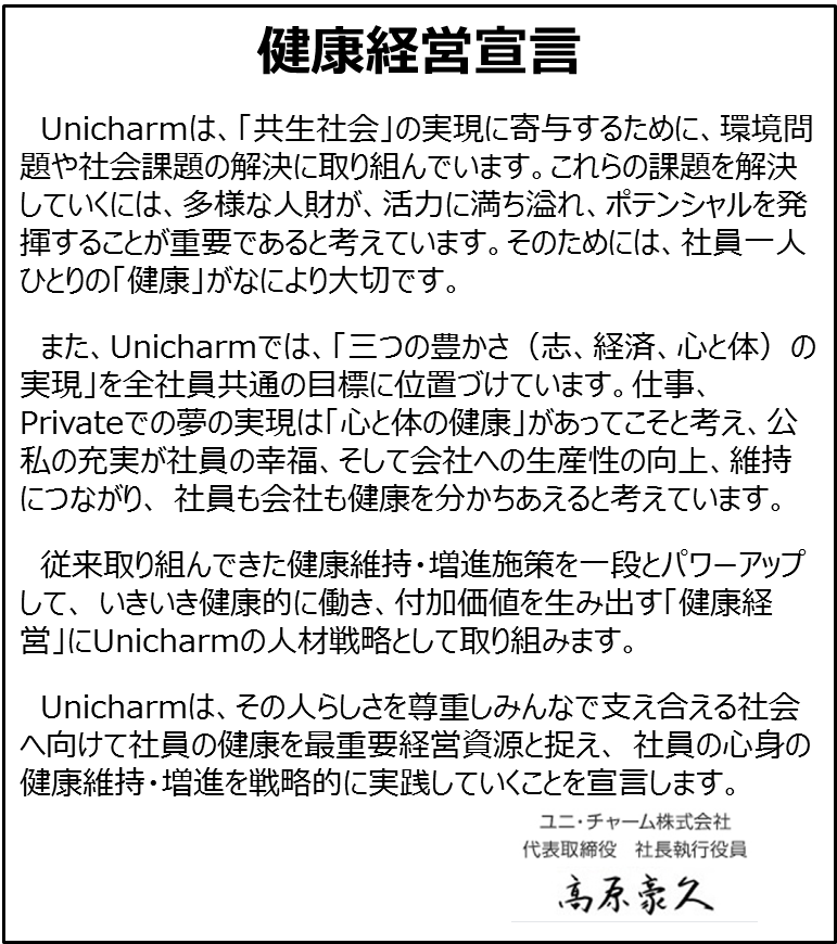 ユニ・チャームは、社員の健康が最も重要な要素であると捉え2007年4月に「健康経営宣言」を制定し、「自分の健康は自分で守る。」を基本に、健康リテラシーを高める健康経営を全社で推進しています。尚、健康経営宣言は適宜見直しをしています。