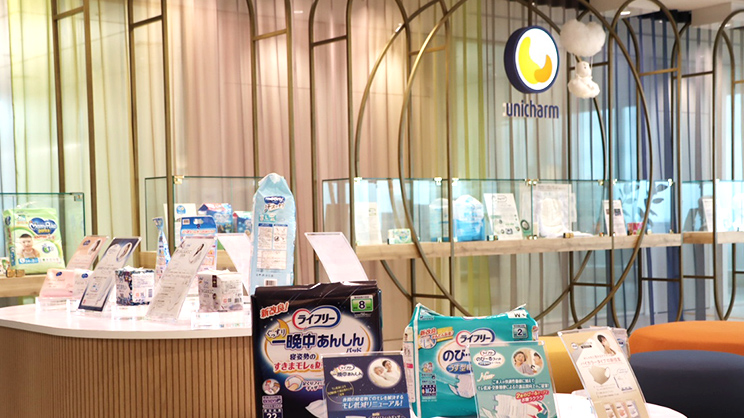 お客さまを最初にお通しする場所です。ユニ・チャームの取り組みや、最新の製品紹介などを実際の商品を交えて展開しています。