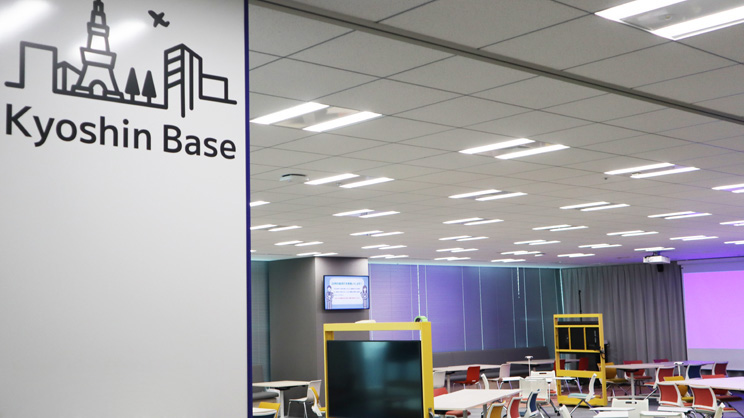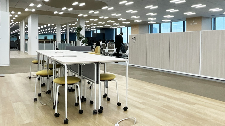 通常はオープンな執務スペースとして、ときには営業部門の全国会議や全社の代表が一堂に集まる表彰式などの大きなイベントの会場にもなる、役員と社員が共振する場が設けられています。