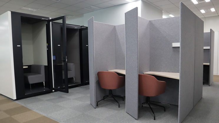 社内外のリモート会議などでも利用しやすい個室タイプのものも各フロアに設置してあります。