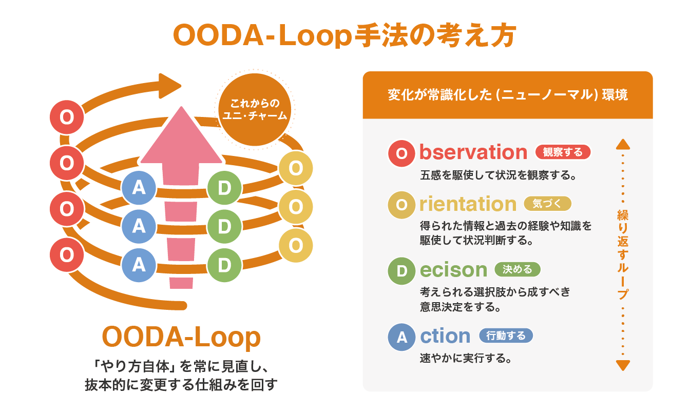 刻々と変化するニューノーマルな世界に対応し、常に先手を打って成長していくために、ユニ・チャームでは、従来のPDCAを重視した「SAPS手法」を進化させた「OODA-Loop」を導入しています。変化の兆しをすばやく察知し、当初立てた計画にこだわらず、常に「やり方自体」を見直していく。現場から得られた「一次情報」から状況の本質を理解し、現場の社員一人ひとりが自律的に行動できる組織を目指しています。求められるのは、小さな習慣の積み重ね。優れた能力の有無よりも、愚直に取り組み続けることが、大きな差に繋がると考えています。