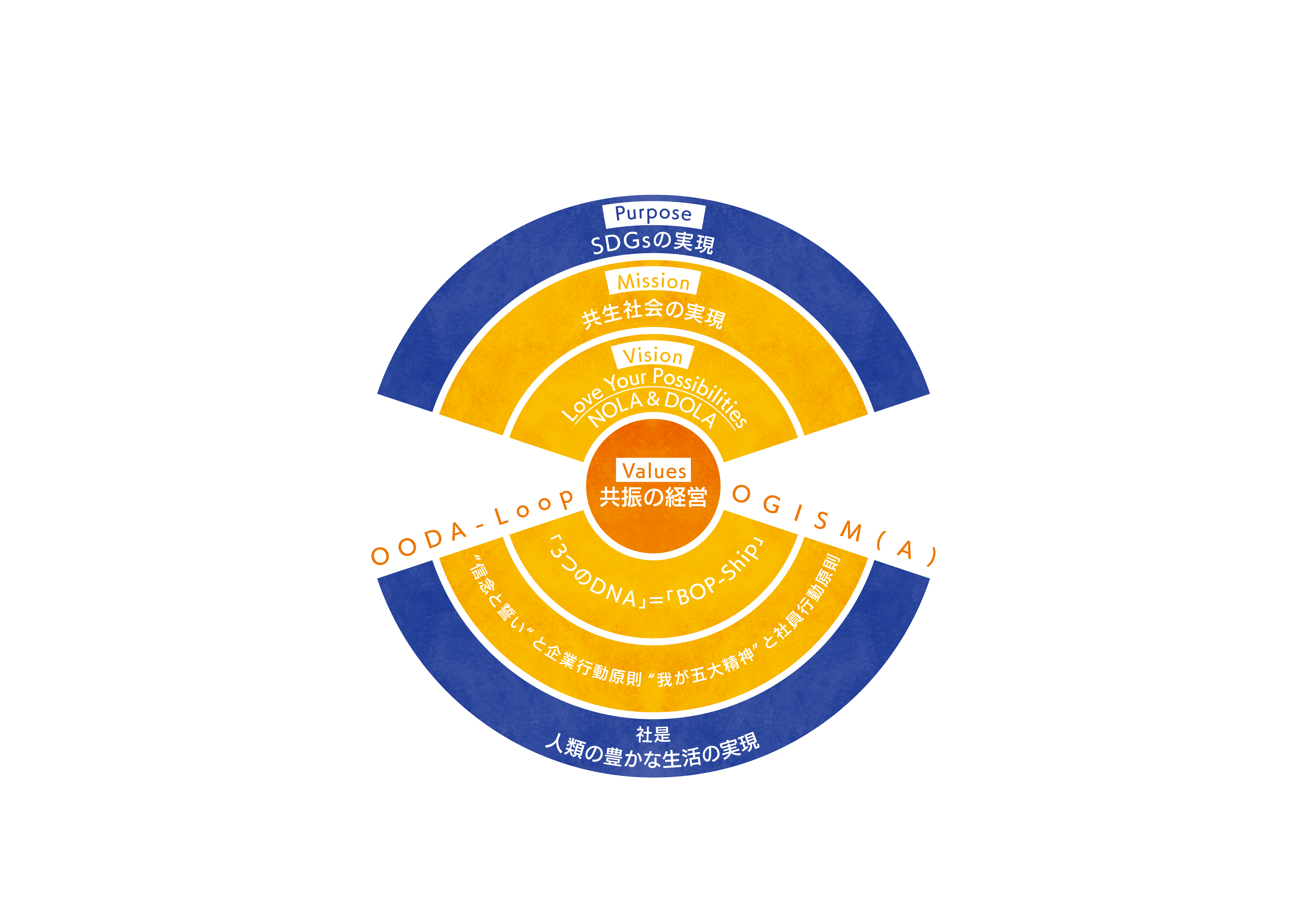 私たちが何を成したいのかを示すMissionは、共生社会の実現。それをどのように実現していくかを明示するVisionが、企業理念でもある「NOLA & DOLA」 (Necessity of Life with Activities & Dreams of Life with Activities)です。「NOLA & DOLA」には、「赤ちゃんからお年寄りまで、生活者がさまざまな負担から解放されるよう、心と体をやさしくサポートする商品を提供し、一人ひとりの夢を叶えたい」という想いが込められています。MissionとVisionを支える根底にある志がValueで、当社では、経営トップと全世界の社員が一体となる「共振の経営」で体現しています。