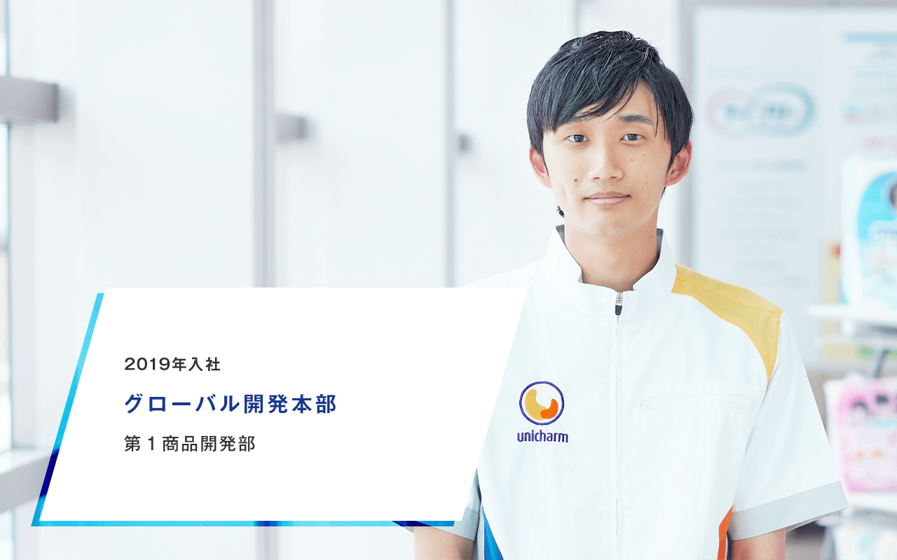 昔から工作や料理など『つくること』が好きで、テレビ番組で文房具メーカーの商品開発者が自分の商品を熱く語っている姿がとても輝いて見えました。そこから「モノづくりを仕事にしたい!」という想いが強くなり、メーカーの商品開発職を志望しました。数あるメーカーの中でもお客様の生涯に携わるメーカーであることに興味を持ち、ユニ・チャームのインターンシップに参加したところ、商品開発の面白さと同時に、赤ちゃん用の紙おむつは、生まれたばかりの尊い命を支えるだけでなく、パパやママが安心して育児ができるようサポートするという使命があることを知りました。そして、誰もが幸せに育児をし隔たりなく協力し合える社会にしていくための商品を開発したいという思いが生まれ、ユニ・チャームへの志望を決めました。