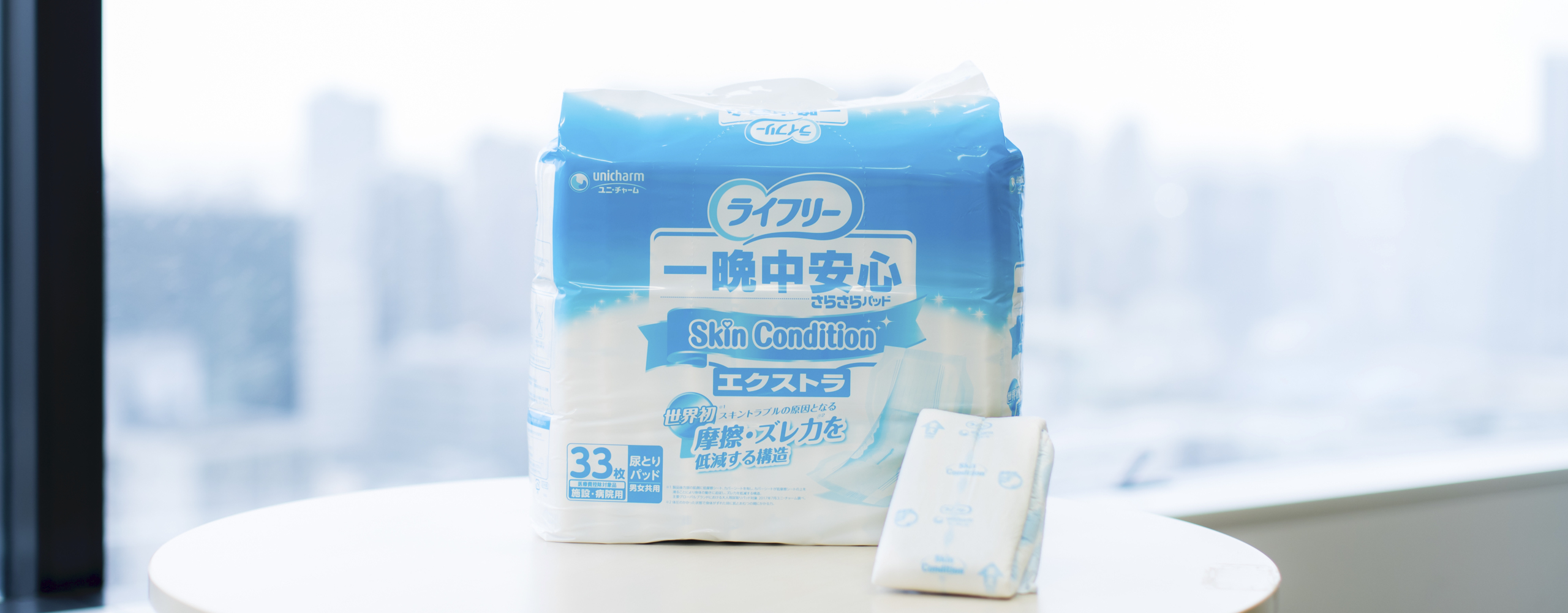 介護の現場における、おむつの交換。それは、介護をされる方にとっても、介護をする方にとっても、大きな負担がかかる。ユニ・チャームの大人用紙おむつブランド「ライフリー」は、おむつの交換回数を減らすことを目指して、日夜、新たな商品の研究・開発に取り組んでいる。特に、就寝中のおむつ交換をなくして「夜間良眠」を目指すことは、ライフリーが掲げるミッションのひとつだ。一方で、長時間おむつを使い続けると、褥瘡(じょくそう=床ずれ)と呼ばれる肌のトラブルにもなりやすく、夜間良眠とスキンケアの両立は、長年の課題となっていた。